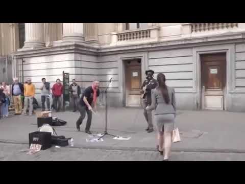 Un musicien de rue chante Bob Marley, une passante s'incruste et fait le...